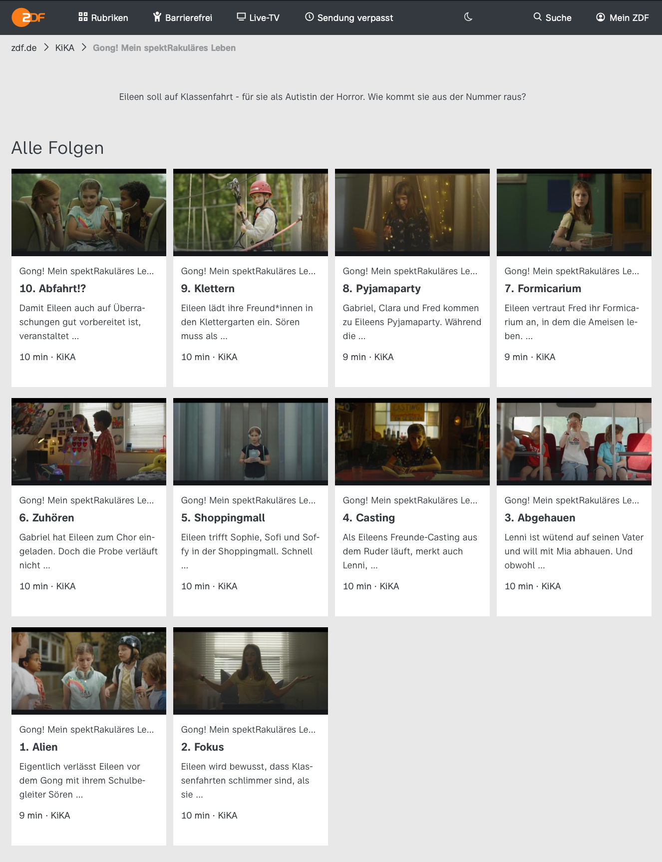 Dramedy-Serie über das Leben auf dem Spektrum. KiKA feiert die Premiere der neuen Fiction-Serie „Gong! Mein spektRakuläres Leben“ (KiKA). Im Mittelpunkt steht der Alltag der zehnjährigen Autistin Eileen. Die Dramedy-Serie über das Spektrum von Freundschaft, über Kinder mit den verschiedensten Facetten und Einzigartigkeiten, zeigt Eileens neurodivergente Wahrnehmung der Welt. Eileen soll auf Klassenfahrt - eine Horrorvorstellung. Deshalb will sie den Ausflug sabotieren. Als sie dank ihres Bruders und seiner besten Freundin sieht, wie spannend Abenteuer sein können, wenn man sie mit guten Freundinnen und Freunden bestreitet, ändert sich ihr Ziel. Sie will bis zur Klassenfahrt auch einen BFF finden.