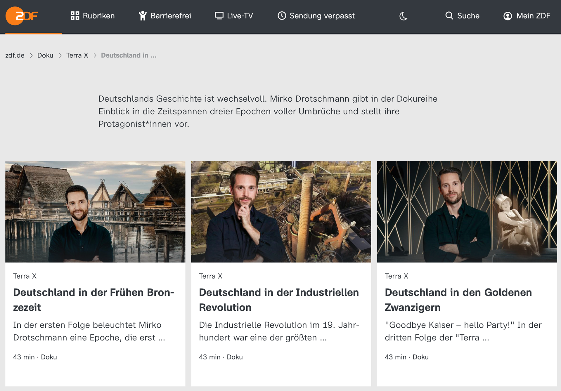 Deutschlands Geschichte ist wechselvoll. Mirko Drotschmann gibt in der Dokureihe Einblick in die Zeitspannen dreier Epochen voller Umbrüche und stellt ihre Protagonist*innen vor.